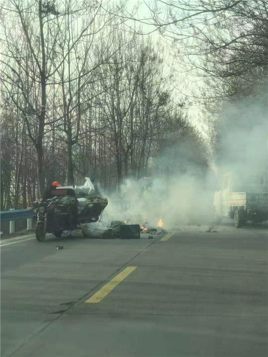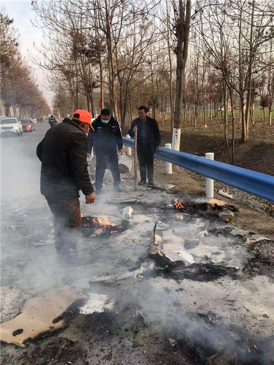 當(dāng)日下午4點(diǎn)左右,太康縣交警大隊(duì)二中隊(duì)指導(dǎo)員南應(yīng)開(kāi)及輔警郭旗全、魯?shù)?、尹晨豪正在趙堂村附近巡邏時(shí),猛然看到前方一輛電動(dòng)三輪車(chē)上有煙氣冒出,巡邏民警加速趕到。原來(lái)是一名老漢的一輛拉著廢舊紙箱的電動(dòng)三輪車(chē)著了火,一車(chē)廢紙和塑料瓶散落一地正在燃燒,火越燒越旺,只見(jiàn)老漢正在手忙腳亂地滅火。這輛三輪車(chē)上拉的全是廢塑料、硬紙殼等易燃物,而且當(dāng)時(shí)正刮著風(fēng),如果不及時(shí)滅火任由火勢(shì)蔓延,后果將不堪設(shè)想??吹酱饲闆r后,南應(yīng)開(kāi)迅速?gòu)木?chē)上拿出滅火器秒變“消防員”,對(duì)著起火的物品進(jìn)行滅火操作,同時(shí)安排輔警對(duì)過(guò)往行人和車(chē)輛進(jìn)行疏導(dǎo)。由于發(fā)現(xiàn)和撲救及時(shí),在民警的緊急救援下,火源很快被眾人合力撲滅。對(duì)太康交警面對(duì)火情臨危不亂、果斷處置、幫助群眾的行為,老漢車(chē)主和過(guò)往群眾紛紛點(diǎn)贊。②6