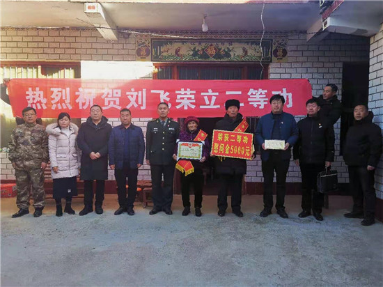 近日,周口市淮陽區(qū)人武部與區(qū)退役軍人事務(wù)局相關(guān)領(lǐng)導,來到該區(qū)四通鎮(zhèn)孔北行政村劉莊村,為在部隊榮立二等功的現(xiàn)役軍人劉飛的父母送去立功喜報,并送上慰問品及慰問金。臨走,劉飛的父親劉啟來說:“請領(lǐng)導放心,俺會讓孩子在部隊更加安心服役,力爭取得更大成績,多為家鄉(xiāng)增光添彩?!保◤埲?張雙斌 攝影報道)