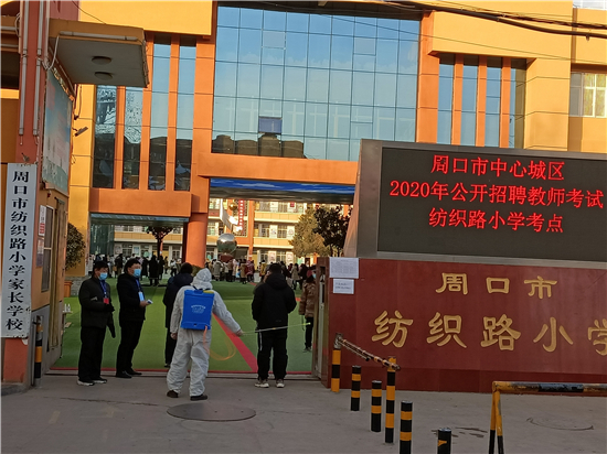 1月10日,周口市中心城區(qū)2020年公開招聘教師考試,考試時間是一天。當天下午,記者在周口市中心城區(qū)2020年公開招聘教師考試紡織路小學考點看到,工作人員在做好考務工作的同時還做好疫情防控工作。圖為工作人員做防疫消殺。
