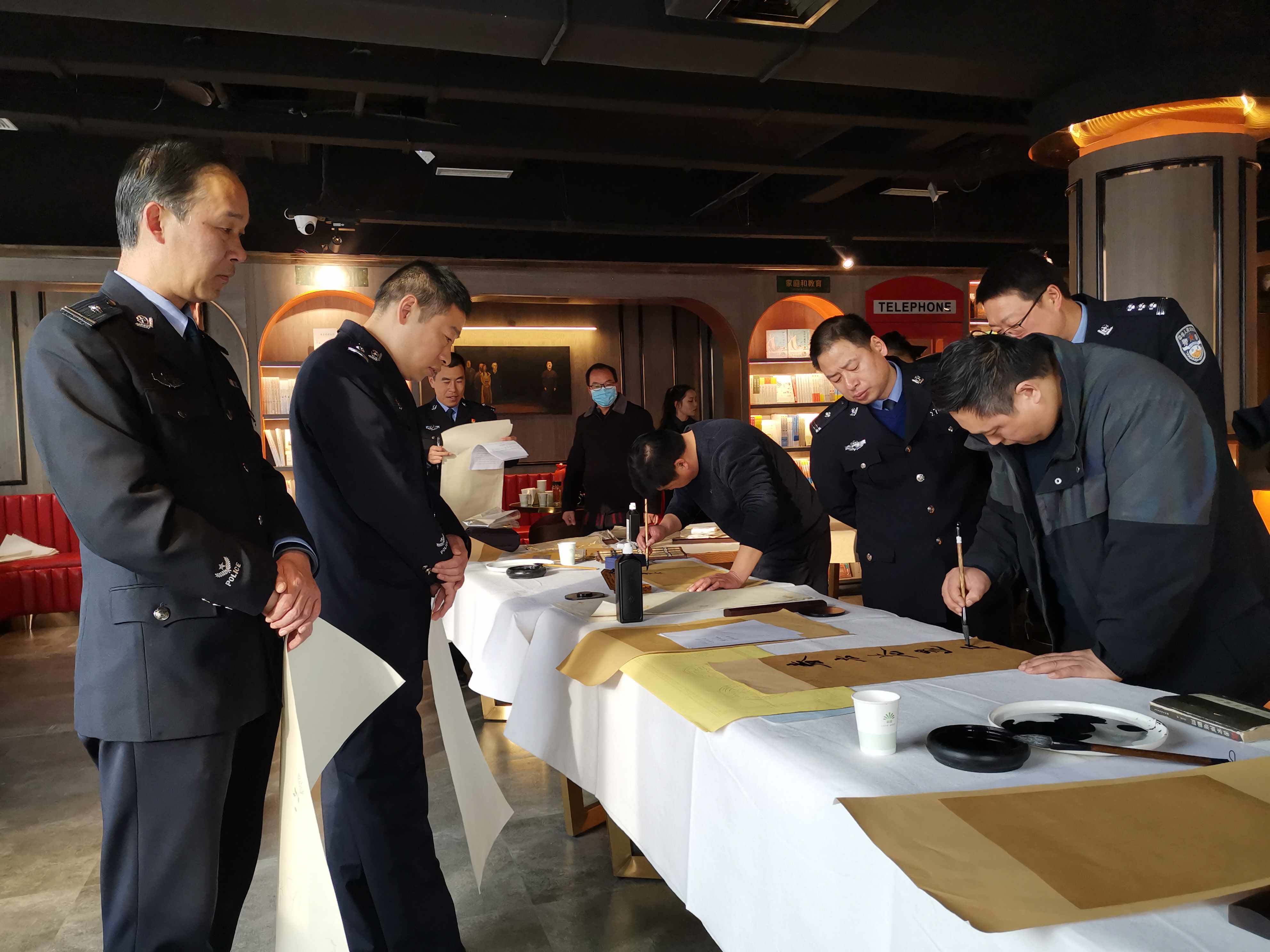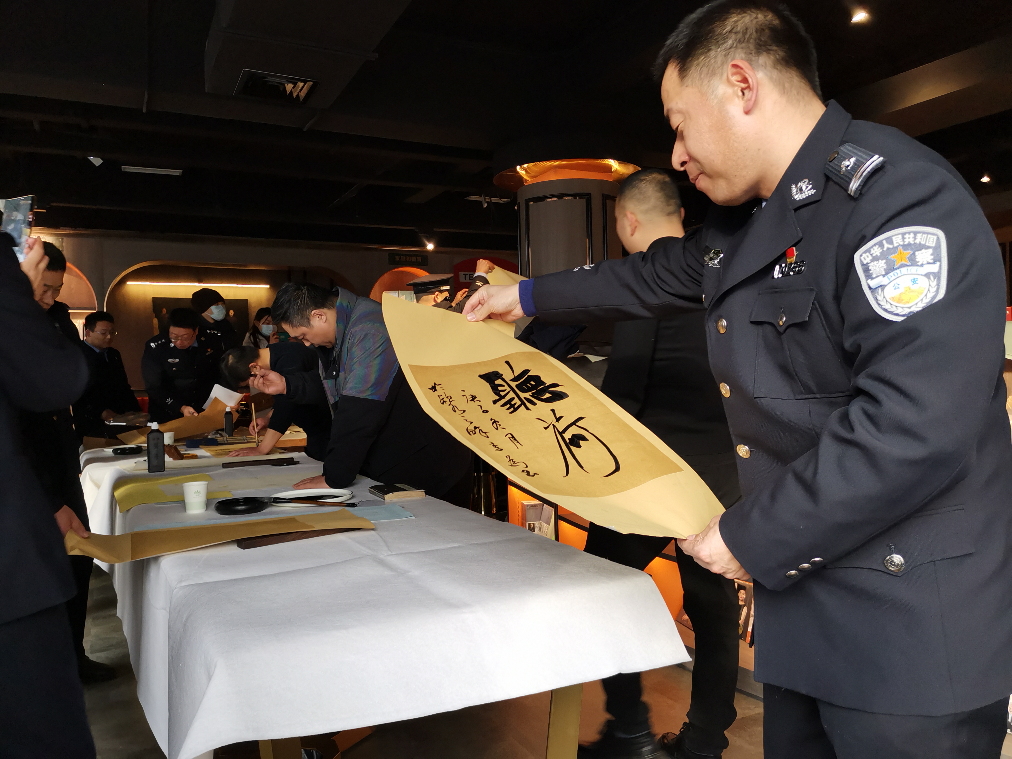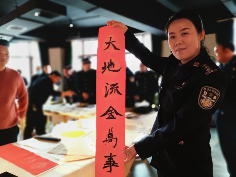 活動(dòng)現(xiàn)場(chǎng),氣氛熱烈,書法家們現(xiàn)場(chǎng)揮毫潑墨、筆走龍蛇,帶著喜迎牛年的美好祝愿。民警、輔警爭(zhēng)相圍觀,觀看、揣摩書法家們蒼勁有力的書法作品,房間內(nèi)洋溢著濃郁的節(jié)日氣息。