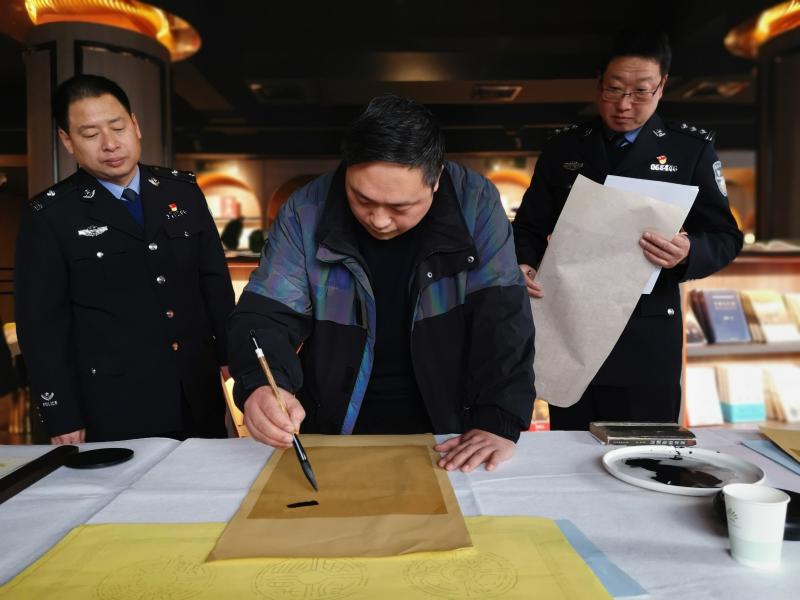 1月10日下午,沽讀書廊二樓翰墨飄香、筆鋒頓挫。為慶祝首個(gè)中國(guó)警察節(jié),書法家李為、何巖、陳濤、游富華、何祥峰、李雯云、軒敬賢以及祁庚鑫等一行,為川匯區(qū)公安分區(qū)民警義寫書法作品,送來一份特殊的節(jié)日禮物。