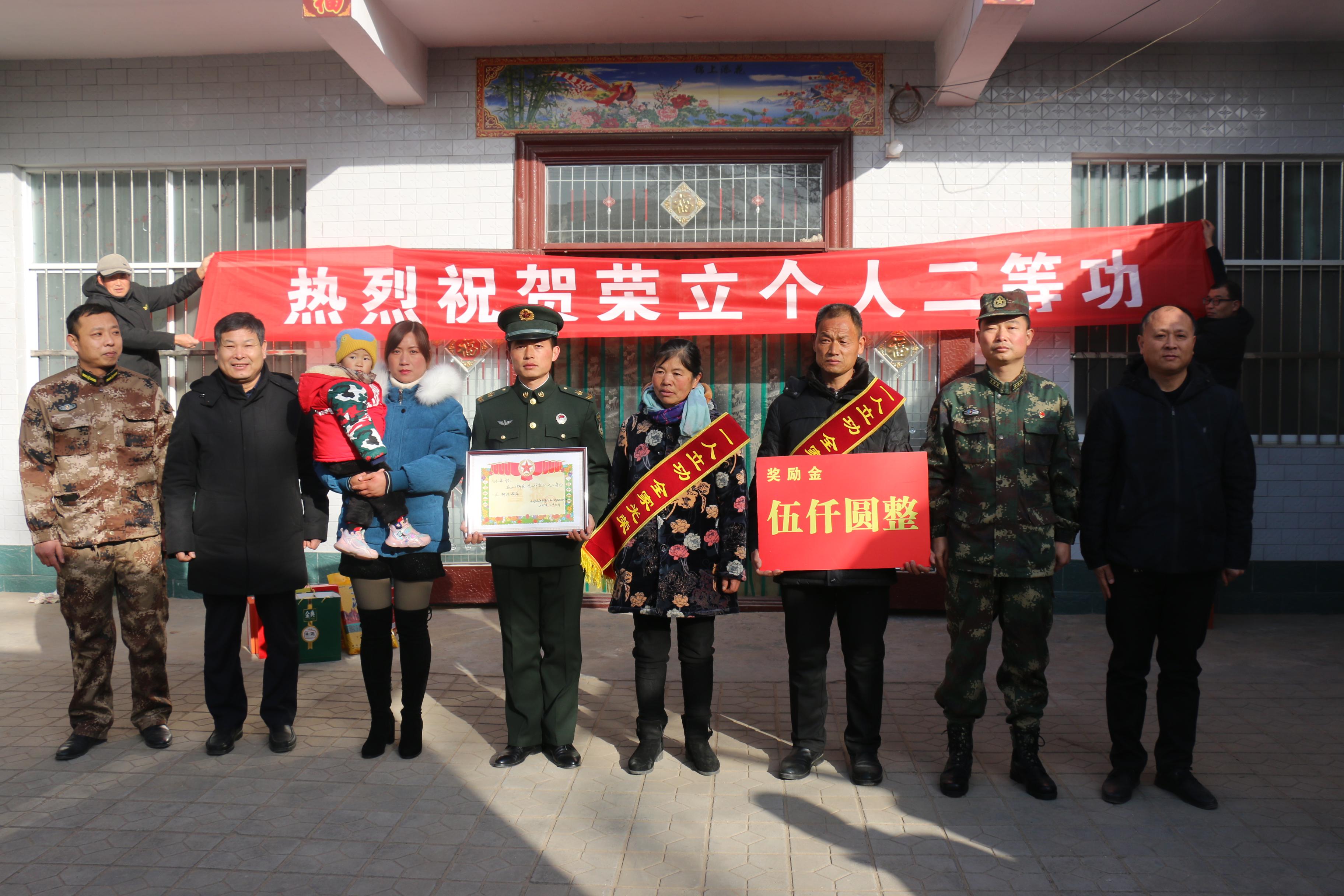 1月12日上午,西華縣西華營鎮(zhèn)雙樓村某部士官高志豪家中鑼鼓喧天,喜氣洋洋。該縣人武部政委涂友佳、縣退役軍人事務(wù)局局長龔坤敬一起把二等功喜報(bào)和“一人立功,全家光榮”的紅色綬帶及5000元現(xiàn)金等送到高志豪及其父母手中。