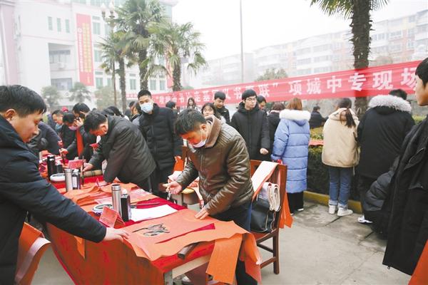 1月23日上午,項城市中等專業(yè)學(xué)校、市書法家協(xié)會聯(lián)合開展了“我們的節(jié)日——義寫春聯(lián)進校園”活動,黃樹民等6位書法家受邀來校為廣大師生義務(wù)書寫春聯(lián)。師生代表紛紛請名家為自己寫春聯(lián),整個活動洋溢著歡樂祥和的氣氛。“我們的節(jié)日——義寫春聯(lián)進校園”活動不僅繼承和發(fā)揚了中華優(yōu)秀傳統(tǒng)文化,而且豐富了在校師生的精神文化生活,助力了書香校園建設(shè),堅定了師生的文化自信。 李立云 郭新明 攝