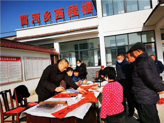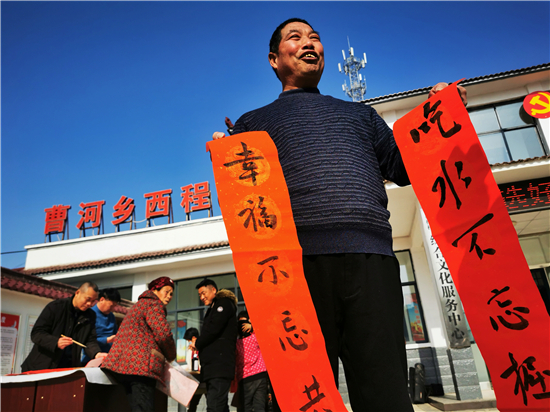 “吃水不忘掘井人,幸福不忘共產(chǎn)黨"。1月30日上午,在淮陽(yáng)區(qū)曹河鄉(xiāng)程樓村,村民孫訓(xùn)濤領(lǐng)到春聯(lián)后邊念邊樂(lè),脫貧后的幸福生活溢于言表。當(dāng)天,淮陽(yáng)區(qū)文聯(lián)組織書法家下鄉(xiāng)義寫春聯(lián),受到群眾熱烈歡迎。