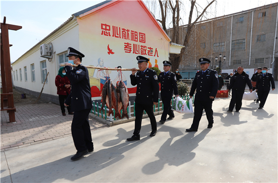 隨著春節(jié)日益臨近,該派出所所長楊杰和大家商議,“送溫暖送祝福”活動,應(yīng)該先從尊老愛幼開始。于是,民警們購買了60斤魚、100斤雞蛋和2袋面粉,利用中午休息時間來到敬老院,給老人們送上新春祝福。