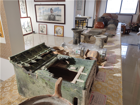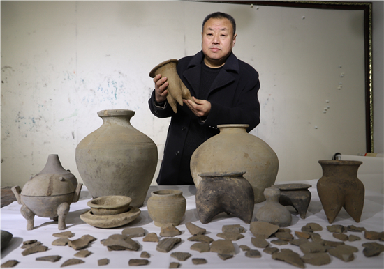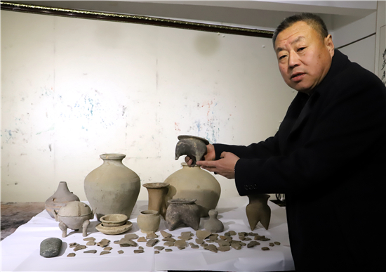 三足燉肉的陶鬲、圓形擦粉的粉盒、前方后圓的灶臺(tái)、帶孔過濾的茶罐、廣口大肚的糧罐、象形浮雕的方磚、雙耳大肚的水壺……1月31日,鄲城縣文聯(lián)副主席、收藏家協(xié)會(huì)會(huì)長(zhǎng)閆振宇打開自己的“博物館”,將多年來(lái)在鄲城縣丁村鄉(xiāng)陶店村出土并收藏的數(shù)十件陶器向記者展示,以此進(jìn)一步證明陶店遺址是龍山文化新時(shí)期石器遺址,疑為中國(guó)灰陶最早生產(chǎn)地,中國(guó)陶器之鄉(xiāng)。
