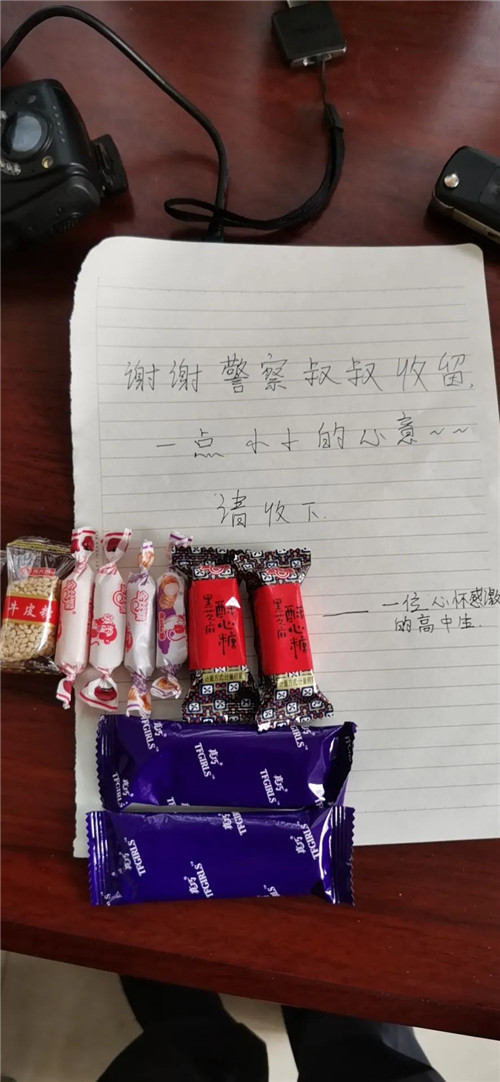 在交警忙于執(zhí)勤時,女孩悄然離去,臨走前留下一封簡短的感謝信和幾顆糖果。