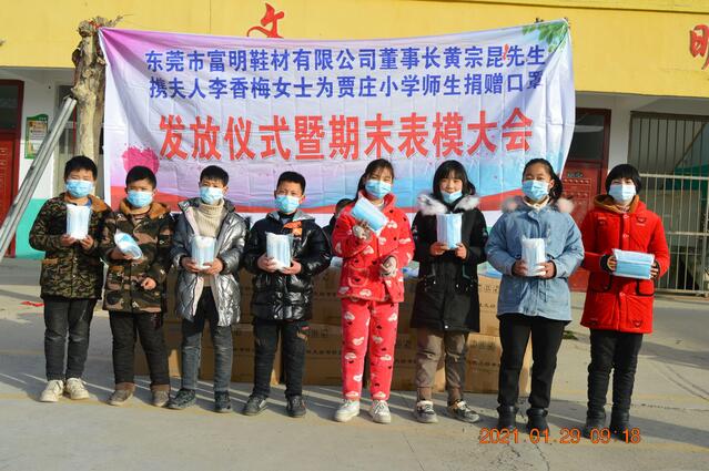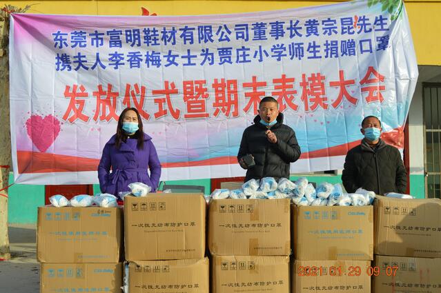 廣東省東莞市富明鞋材有限公司董事長黃宗昆先生及夫人李香梅女士原籍太康縣馬頭鎮(zhèn)薛廟村,他們得知寒假將至,正值師生、家長返鄉(xiāng)團聚、走親訪友高峰時節(jié),當前疫情防控面臨境外疫情持續(xù)爆發(fā)流行、國內散發(fā)病例頻發(fā)的新情況、新挑戰(zhàn)。為了確保賈莊小學300多名師生生命安全和身心健康,以及他們近期疫情防控對口罩的需求,進一步增強師生的防控意識,夫妻二人決定為該校捐贈3萬只一次性醫(yī)用口罩,以實際行動助力該校疫情防控工作。