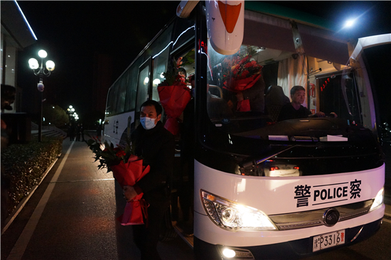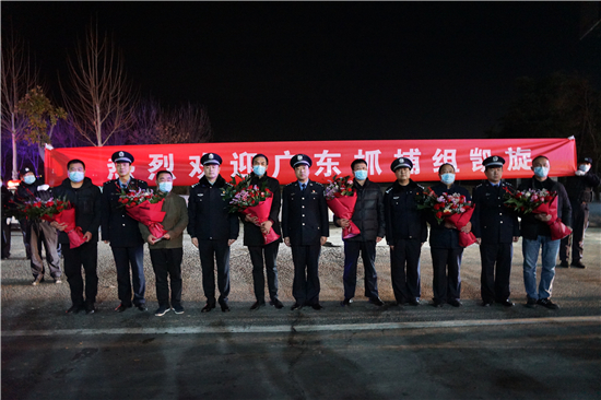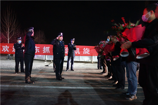 英雄凱旋,鮮花致敬。2月6日夜晚11時許,寧洛高速項城北收費站警燈閃爍、隊列整齊,項城市公安局在這里隆重舉行儀式,熱烈歡迎 “1.8”專案組民警勝利歸來。副市長、公安局長萬東偉,局黨委副書記、副局長陳重,局黨委委員、政辦室主任衛(wèi)偉,局黨委委員袁啟峰等領導出席儀式,部分民警代表參加了儀式。萬東偉同志代表局黨委對此案的成功偵破表示熱烈祝賀,真誠感謝專案組民警的辛勤付出,并向大家致以崇高的敬意。