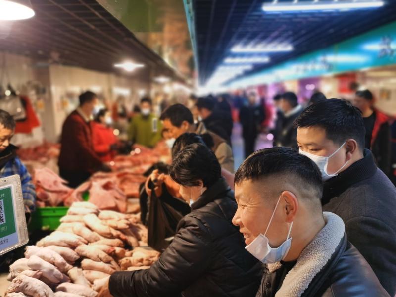 2月10日一大早,位于周口市的最大的黃淮農(nóng)貿(mào)市場里熙熙攘攘,熱鬧豐常,行人小心翼翼地從來往的各式貨車間穿過,客商們被格外熱鬧的攤位吸引,駐足詢價(jià)、了解行情。圖為熱鬧的肉類銷售區(qū)域內(nèi)市民在選購。