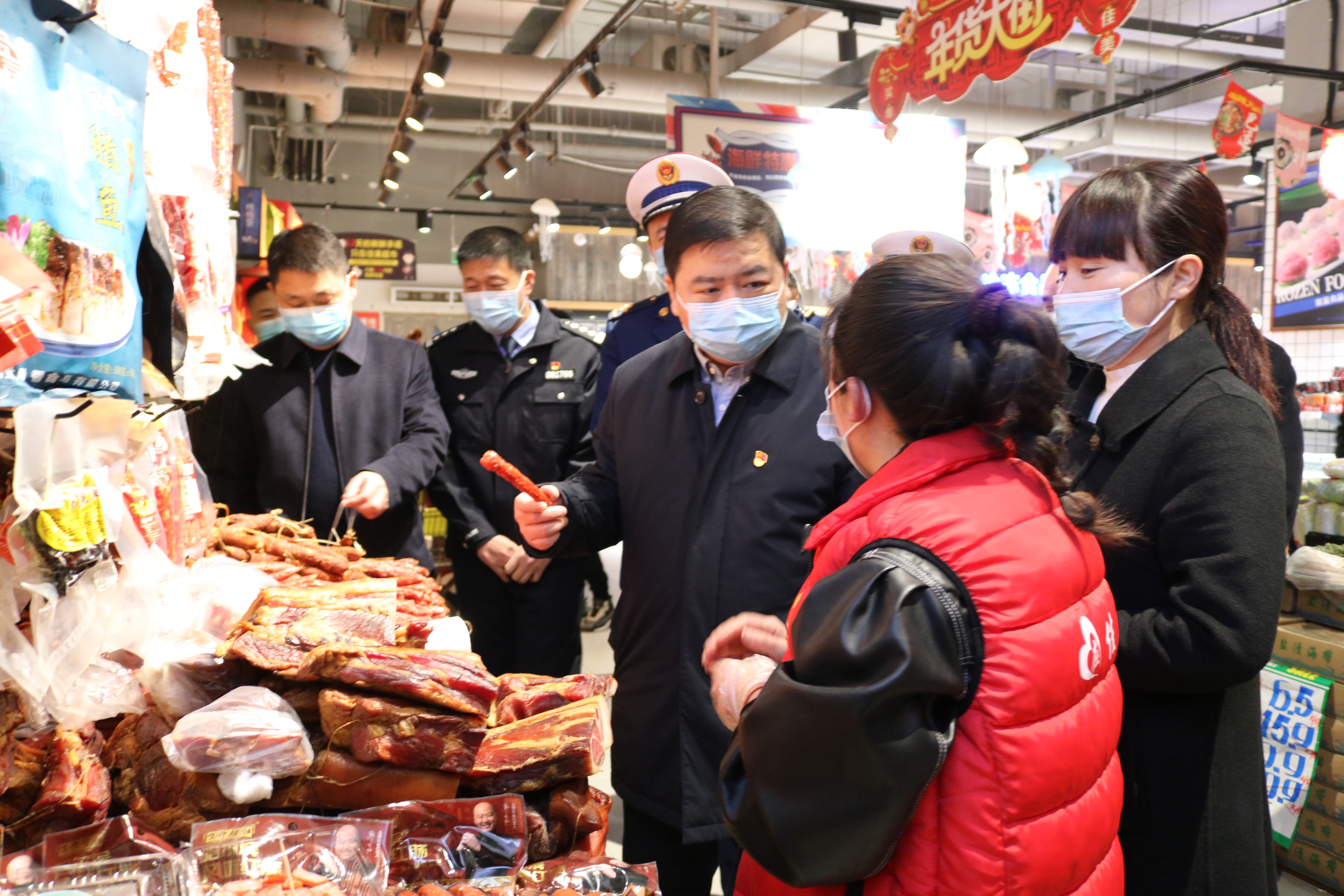 在佳美新時代超市,李剛來到食品區(qū)、生鮮區(qū)、綜合區(qū),了解節(jié)前物資供應(yīng)、商品價格、食品安全等情況。李剛指出,臨近春節(jié),采購年貨的人多,人員流通性大,疫情防控工作絲毫不能放松,要高度重視春節(jié)期間食品安全及市場供應(yīng)情況,加大監(jiān)管和巡查力度,加強監(jiān)測和調(diào)控手段,確保價格平穩(wěn)。同時要保持消防通道暢通、定期檢修消防器材、排除安全隱患,讓群眾過一個平安、愉快、祥和的節(jié)日。