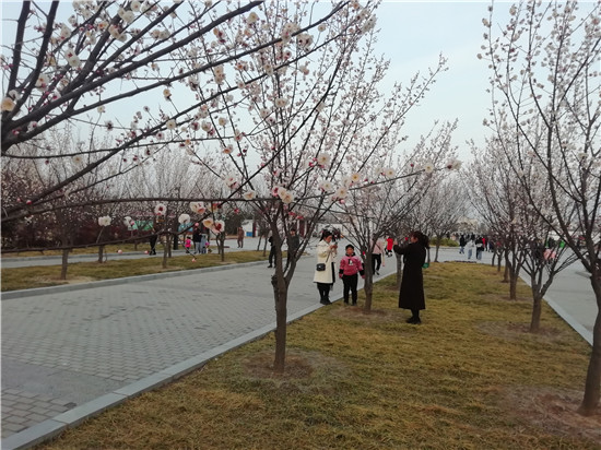春節(jié)期間,陽光燦爛,眾多市民呼朋引伴選擇近郊游。新落成的淮陽梅園每天迎來成群結(jié)隊(duì)的市民。這里臘梅等花樹次第開放,湖水澄清,大白鵝引頸高歌,還有精致的木質(zhì)棧橋等,一步一景,成為人們休閑游玩的好去處。記者 侯俊豫 攝