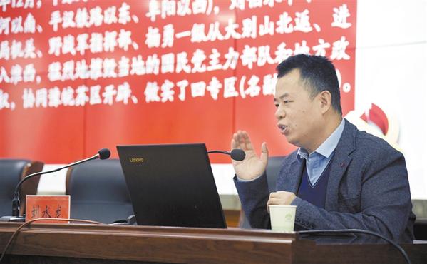 2月26日下午,商水縣舉行學(xué)黨史國史紅色教育大講堂活動。商水籍北大學(xué)子劉水龍結(jié)合史料,精彩講述賀龍北伐在商水播下革命火種、彭雪楓經(jīng)周口東進(jìn)豫皖蘇燃起商水革命烈火、豫皖蘇軍區(qū)解放周口商水浴火重生,以及火熱革命中涌現(xiàn)出來的商水英烈艾力、趙海靜,支前模范徐乃貞等人的英勇事跡。這些生動鮮活的歷史人物故事,再現(xiàn)了英雄兒女在商水大地上勇于革命、不怕犧牲的紅色革命歷史。劉水龍用豐富的史實、鮮明的觀點、精辟的講述,贏得臺下聽眾陣陣掌聲。記者 付永奇 攝