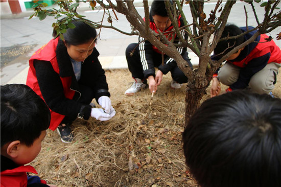 孩子們?cè)诶蠋煹闹笇?dǎo)下,手拿勞動(dòng)工具有模有樣的給校園內(nèi)香樟樹(shù)、月季園、櫻花園、銀杏樹(shù)、空中花箱等施肥,班主任老師將這次勞動(dòng)教育親切的稱為“給花草開(kāi)開(kāi)葷”。