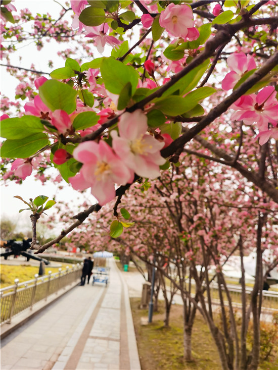 公園里的海棠花繼紫葉李花后,已經(jīng)進(jìn)入盛花期,最集中的地方在公園西門附近,一條美麗的海棠花小道正在靜待四方來(lái)客。樹上已經(jīng)開滿粉紅色的小花,潔白的花瓣、微紅的花蕊。目前有不少市民來(lái)此觀賞。