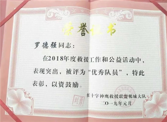 鄲城縣神鷹救援隊(duì)隊(duì)長(zhǎng)劉勇說,正是看到了羅德強(qiáng)的優(yōu)秀品質(zhì),2018年將羅德強(qiáng)吸納為神鷹救援隊(duì)員?!吧聱椌仍?lián)盟鄲城大隊(duì)隸屬于中國(guó)神鷹救援隊(duì),由各個(gè)行業(yè)的志愿者組成,也是河南省成立最早的一支民間救援隊(duì),除參加全國(guó)各地災(zāi)后救援活動(dòng)外,日常積極參加社會(huì)志愿者活動(dòng)?!薄拔乙粋€(gè)人的力量很有限,加入這個(gè)優(yōu)秀集體,能夠?qū)W到更多專業(yè)救援知識(shí),從而幫助更多的人,我感到非常驕傲和自豪?!绷_德強(qiáng)說。2019年8月10日,受第九號(hào)臺(tái)風(fēng)“利奇馬”影響,山東省壽光市、東營(yíng)市等部分地區(qū)遭受洪災(zāi)。8月11日晚上,紅十字神鷹救援聯(lián)盟鄲城大隊(duì)趕赴山東壽光救災(zāi)。面對(duì)洪災(zāi),羅德強(qiáng)和其他救援隊(duì)員不畏辛苦,劃船深入各個(gè)受災(zāi)鄉(xiāng)村救助被困群眾。壽光市一鄉(xiāng)鎮(zhèn)3處大閘因斷電出現(xiàn)險(xiǎn)情,需要人力進(jìn)行開閘泄洪。羅德強(qiáng)和隊(duì)員冒險(xiǎn)攀爬到大閘上進(jìn)行人工作業(yè),經(jīng)過3個(gè)多小時(shí)的奮戰(zhàn),3處大閘全部打開,安全泄洪。2019年9月1日,參加泳渡日月潭返程途中,羅德強(qiáng)在福建高速公路上,發(fā)現(xiàn)前方車輛發(fā)生車禍,一名司機(jī)腿部骨折、血流不止。他立即下車和司機(jī)溝通,一邊報(bào)警,一邊利用專業(yè)救援知識(shí)打開變形的車門,順利將司機(jī)救出。“由于過度驚嚇,司機(jī)以骨折為由拒絕下車。當(dāng)我告訴司機(jī)自己是神鷹救援隊(duì)員、救援技術(shù)過硬后,才同意我們施救?!碑?dāng)時(shí)高速上車流密集,情況十分危險(xiǎn),如果司機(jī)不能及時(shí)救出,后果不堪設(shè)想?!拔覀冘囕v加油、住宿、吃飯等救援費(fèi)用都是隊(duì)員AA制負(fù)擔(dān),從來不給當(dāng)?shù)卣蚓戎颂砣魏温闊?。?/p>