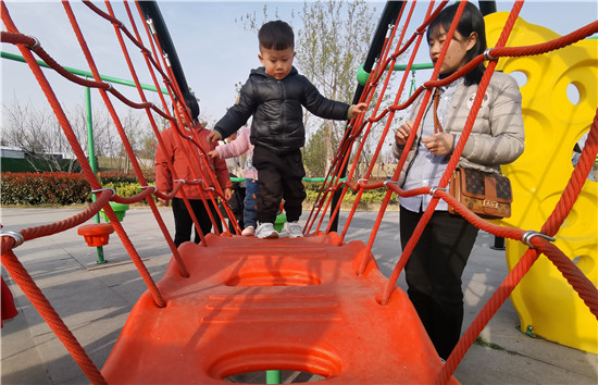 在周口公園內,園內春意盎然,一株株垂柳隨風搖擺,各種花開正盛,市民循著春天的腳步,品味草長鶯飛的春色美景。游樂設施區(qū)內孩子們盡情地玩耍,臉上洋溢著開心地笑容。
