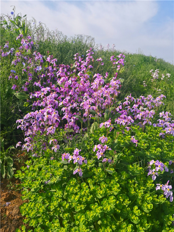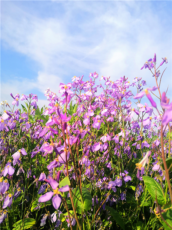 據了解,諸葛菜也叫二月蘭,因早春農歷二月前后開花,所以叫二月蘭,花開溫柔,娟秀,清雅,很是招人喜歡。而且具有較強的耐寒性與適應性,自繁能力比較強,一次播種能年年自成群落,能夠有效控制裸地揚塵起沙、抑制雜草生長。諸葛菜花花期相當長,能夠從早春時節(jié),一直開到暮春初夏間,當百花盛開時,它依然露著笑臉。因此著實是春天里的“早到遲退”之花。③5