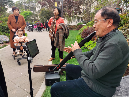 4月12日,中心城區(qū)文明路與七一路交叉口的街頭游園內(nèi),櫻花盛開,綠坪如茵,老人們在自娛自樂,很是幸福愜意。