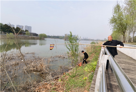 4月16日,周口植物園管理人員及保潔人員在打撈漂浮在湖水中的垃圾及枯草。為了給市民提供一個(gè)干凈、優(yōu)美的園內(nèi)環(huán)境,植物園的工作人員每天都會(huì)清理打撈湖水中的雜物。