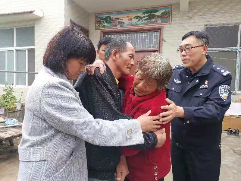 “我的兒啊,這下可找到你了,都認(rèn)為你再也回不來啦……”4月21日下午,在周口市淮陽(yáng)區(qū)馮塘鄉(xiāng)于劉寨村劉某家的四合院里,劉某73歲的老母親失聲痛哭,用顫抖的雙臂緊緊擁抱走失27年的兒子劉某,這一抱是久違了的27年母子情,母子倆泣不成聲。在場(chǎng)的民警和村民無不為之動(dòng)容,人人淚眼模糊。三里五村的村民聽說后,也紛紛來到現(xiàn)場(chǎng),當(dāng)他們得知?jiǎng)⒛郴丶业膬?nèi)情,紛紛對(duì)派出所民警夸獎(jiǎng)。