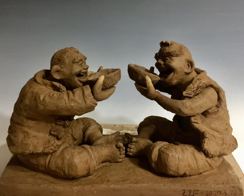 隨后,張振福又介紹了近期創(chuàng)作的慶祝中國共產(chǎn)黨成立100周年紅色主題泥塑《征途漫漫》《長在黨旗下》《淮海戰(zhàn)役》《一個蘋果的故事》等。李尚武贊賞張振福泥塑風(fēng)格獨(dú)特、主題鮮明,傳遞了正能量,作品具有思想性、藝術(shù)性,充滿鄉(xiāng)情味、泥土味。