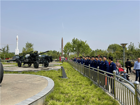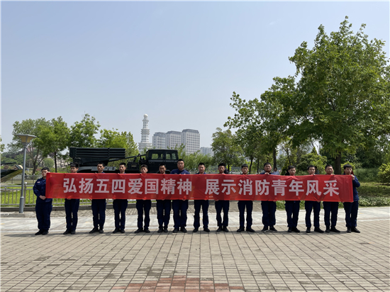 5月4日上午,天氣晴朗。在周口公園,周口市城鄉(xiāng)一體化示范區(qū)消防大隊的青年消防隊員們通過跑步訓練等方式慶祝五四青年節(jié)。消防隊員欒慶帥告訴記者:“今天是五四青年節(jié),我們通過訓練、參觀國防設施這樣的方式,來表達我們的愛國熱情?!?span style="text-indent: 32px;">②9