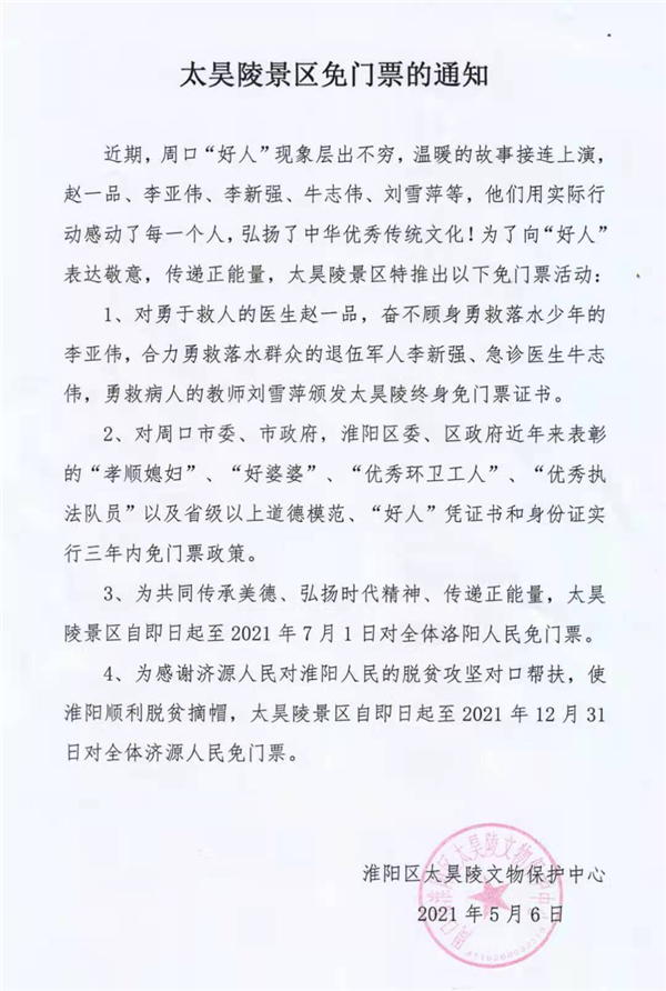 同時(shí),為共同傳承美德、弘揚(yáng)時(shí)代精神、傳遞正能量,太昊陵景區(qū)自即日起至2021年7月1日對(duì)全體洛陽(yáng)人民免門票;為感謝濟(jì)源人民對(duì)淮陽(yáng)人民的脫貧攻堅(jiān)對(duì)口幫扶,使淮陽(yáng)順利脫貧摘帽,太昊陵景區(qū)自5月6日起至2021年12月31日對(duì)全體濟(jì)源人民免門票。②7