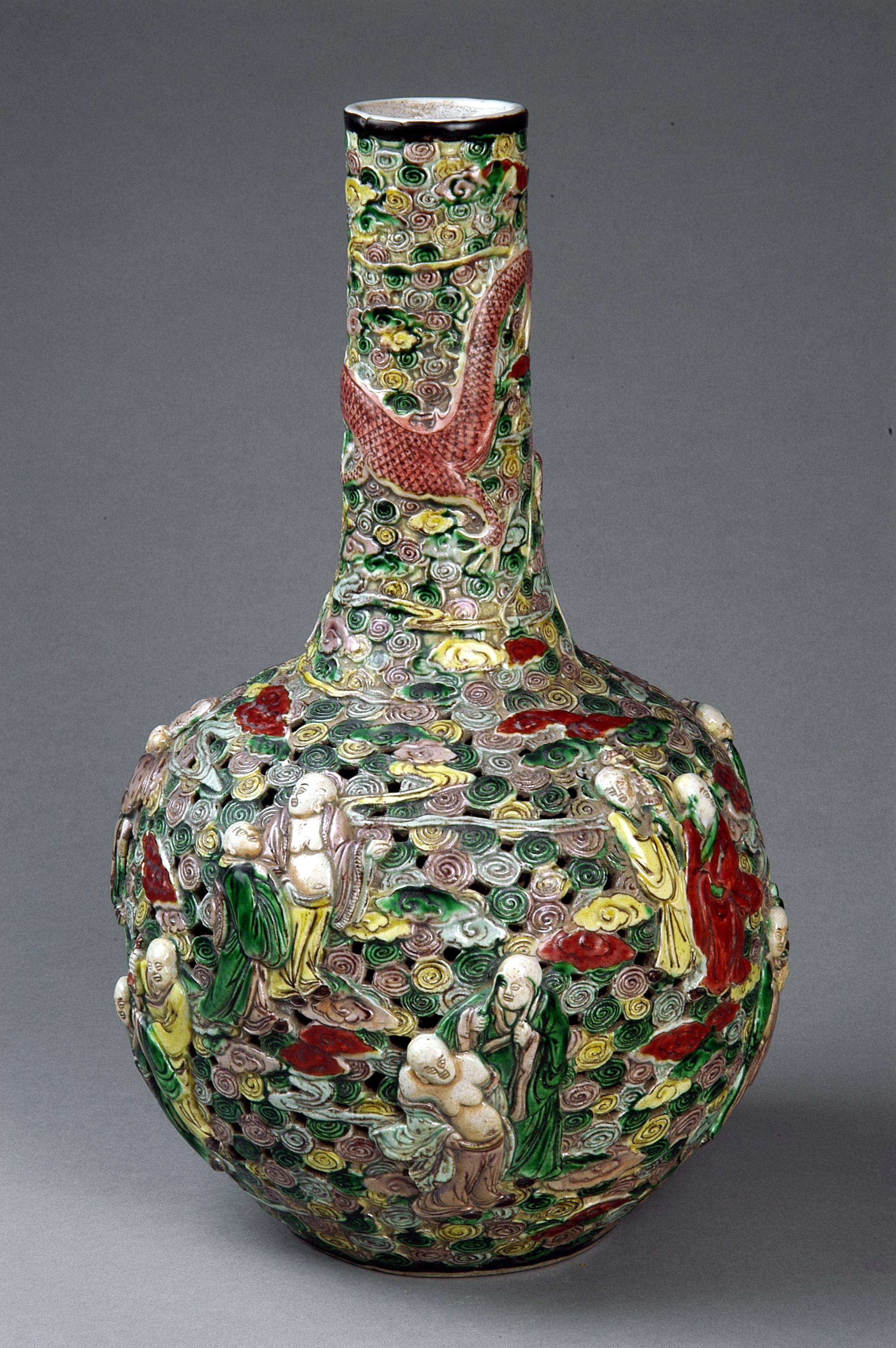 我是五彩透雕十八羅漢云龍瓶,又名古瓷流韻天球瓶。靜謐的空間里,我站在周口市博物館的玻璃展柜里,瞅瞅四周的兄弟姐妹,我偷偷笑了。雖沒有長睫毛和雙眼皮,但我可是個(gè)十足的“混血兒”。技藝精湛、圖案華貴、色彩艷麗,我的稀有性和珍貴性常常讓來訪者驚嘆不已。和青花瓷相比,我更加瑰麗多彩,人稱文物界的“米蘭·可兒”。