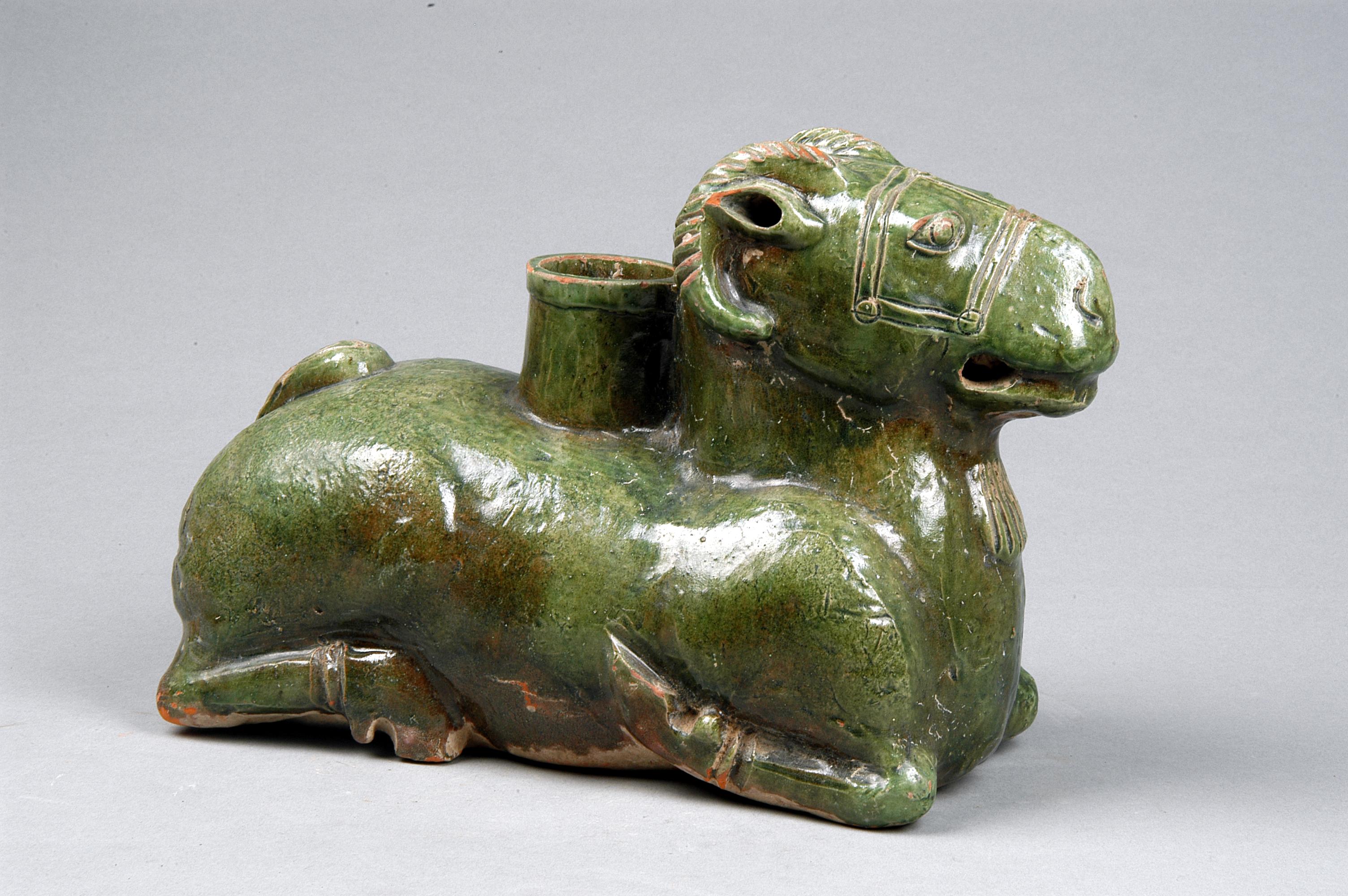 什么叫“尊”呢,就是你們現(xiàn)在說(shuō)的酒杯。我就是用來(lái)喝酒的容器。關(guān)于造型呢,別期待我硬朗干練,我是寓意吉祥的一只小羊,是溫順善良的化身,線條流暢,神采奕奕。我身長(zhǎng)36.6厘米,寬15.8厘米,高23厘米,口徑5.4厘米,臥姿跪地,嘴巴微張,紅陶質(zhì)地,綠釉作為裝飾色彩,遍布全身,釉色碧綠明凈,是漢代鉛釉陶中的珍品。