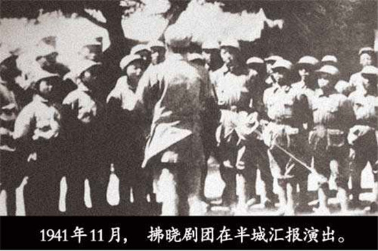 1938年深秋,劇團到泌陽縣鄧莊鋪演出,群眾自動地找木棍、找門板、挖土埋柱子,很快搭起一座戲臺,掛上幕布,點燃油燈,男女老少坐在戲臺前的空地上。戲臺上先是演員們合唱抗日歌曲《新四軍軍歌》《游擊隊歌》《到敵人后方去》等,后演出話劇《突擊》。當劇中的老爺爺抱著被日寇殺死的孩子,含淚控訴敵人的暴行時,臺下的觀眾禁不住地憤怒高呼:“打倒日本帝國主義!把日本鬼子趕出中國!”1939年11月初,徐海東隨劉少奇由竹溝到華中路過新興集,彭雪楓命拂曉劇團組織一個晚會,以示熱烈歡迎。拂曉劇團接受任務(wù)后,大家爭分奪秒,只用了一天時間,就集體創(chuàng)作排練出京劇《徐海東粉碎日寇“掃蕩”》,第二天就在歡迎晚會上演出。