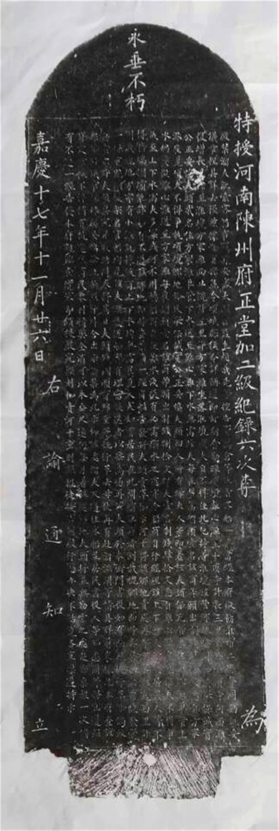 說它“緘默不語”,其實(shí)并不準(zhǔn)確。這通石碑通體有字,碑的陽面為清同治八年四月十六日淮沈項(xiàng)分縣縣丞孫茂悟所刊刻的嚴(yán)禁溜夫訛索客船事告示,碑的陰面為附文,內(nèi)容為重刊的清嘉慶十七年十一月二十六日陳州知府李振翥制定的嚴(yán)禁溜夫訛索客船事章程,是對(duì)公告內(nèi)容的重申,兩面碑文內(nèi)容大致相同,加起來共有1100余字,均為約束溜夫行為的公告或章程。碑首追刻的有四個(gè)大字:永垂不朽。