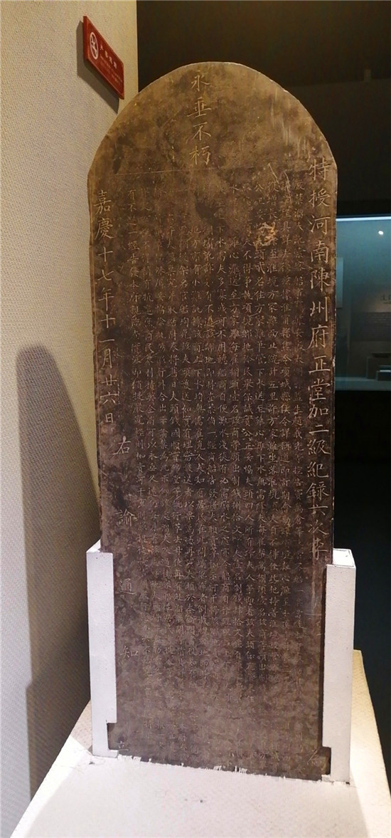 這家店的主人叫段清海,他從事刻碑行業(yè)多年,經(jīng)驗(yàn)頗豐,從第一眼看到這通石碑,憑直覺就感覺它來歷不凡。“當(dāng)時(shí)那個(gè)人把這通碑送到店里,要求把上面的字磨掉,重新刻成一塊墓碑。我仔細(xì)一看,這通碑的表面雖然有些微磨損,字跡稍顯模糊,但細(xì)致觀察,能發(fā)現(xiàn)碑文的落款為清嘉慶十七年(1812年)和清同治八年(1869年)。也是不忍心吧,我沒有把它毀掉,而是免費(fèi)為那個(gè)人刻了一通新碑,就把這通年代久遠(yuǎn)的舊碑留下來了?!倍吻搴;貞浾f,2012年的時(shí)候,他聽說周口市博物館面向全市征集古物,他第一時(shí)間把石碑送交到周口市博物館,沒有要一分錢,“它在我的店里放了四年,期間好幾次差點(diǎn)被送貨拉貨的工人損壞,交給博物館總算是給它找了一個(gè)‘安穩(wěn)’的家,我的心里也算踏實(shí)了”。