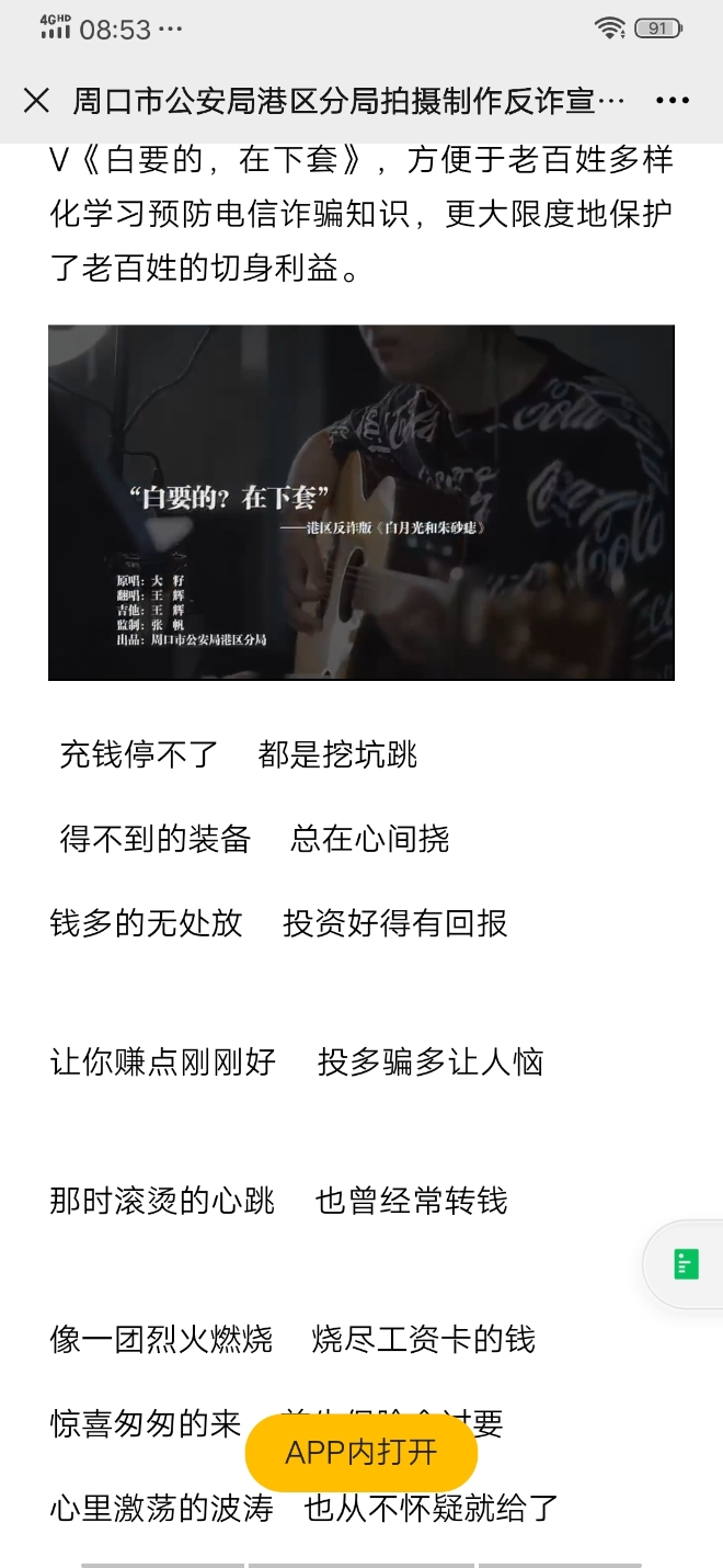 據(jù)悉,為進(jìn)一步提升轄區(qū)群眾防騙、識(shí)騙、拒騙能力,有效遏制網(wǎng)絡(luò)電信詐騙案件高發(fā)態(tài)勢(shì),周口市公安局港區(qū)分局以張貼廣告條幅、深入各企事業(yè)單位開(kāi)展宣傳講座等措施完成原有“規(guī)定動(dòng)作”,不斷創(chuàng)新宣傳方式,從電信詐騙的種類、手段、作案特點(diǎn)以及甄別電信詐騙的方法和技巧等方面進(jìn)行制作宣傳,營(yíng)造了濃厚的防電信詐騙宣傳氛圍。截至目前,該分局推廣、注冊(cè)“金鐘罩”APP達(dá)20000人次,取得明顯效果。③5