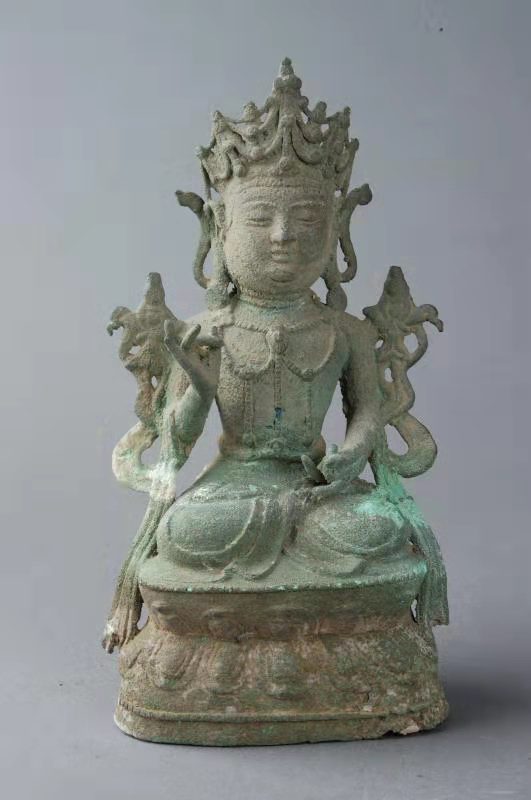 商水壽圣寺塔,高41.5米,為九級樓閣式磚塔。塔體從底至頂漸收勻稱,平面呈正六邊形。塔頂用鑄鐵鑄成葫蘆形寶頂,給人以挺拔雋秀之感。塔的層檐收放尺寸設(shè)計精妙,既保護了塔墻免遭雨雪侵蝕,又使塔體顯得莊重肅穆。塔身諸層外壁皆辟有圓券門、破子欞假窗,塔身各角砌出倚柱,檐下密布磚雕斗拱。塔內(nèi)砌出塔心室和盤旋梯道,可逐層登高至塔頂。塔第一層,南面辟門,門楣上刻“明道二年癸酉歲三月一日丙寅時戊寅日,葬舍利院主。僧□□建□□功德塔”。說明建塔的年代是北宋。塔室為穹窿頂。東南、西南兩壁有破子欞盲窗各1個,西壁另辟一拱券門,有踏道可登至第二層塔心室。第二層,南面辟門,東南、西南兩壁各砌一盲窗,東壁另辟一門可沿踏道進入第三層。以上諸層大同小異。第四層,塔心室內(nèi)北墻嵌石雕佛像3尊,兩尊盤膝正面像,一尊盤膝背面像。剎柱下端插入塔心室,上端置鐵質(zhì)寶瓶,在不同部位還發(fā)現(xiàn)“風調(diào)雨順”“國泰民安”“周王千歲千千歲”“大明嘉靖二十八年九月吉日”“河南周府施舍西華小瑤集壽圣寺塔一座”等字樣,這些都說明了明代嘉靖年間,又重修了塔身。1998年9月,在維修該塔時,在天宮清理出明代銅佛像3尊,白釉瓷盤1只,白釉黑花瓷碗、白釉褐花瓷碗各1個,刻印大彌陀經(jīng)1卷。銅佛像高約20厘米,其中一尊有“嘉靖三十一年”字樣,這一時期的周王為周敬王朱在鋌,這說明嘉靖三十一年周敬王朱在鋌為祈福曾將這批器物和經(jīng)卷,置入了塔頂?shù)蔫F質(zhì)寶瓶中。