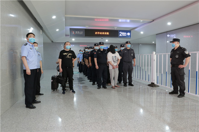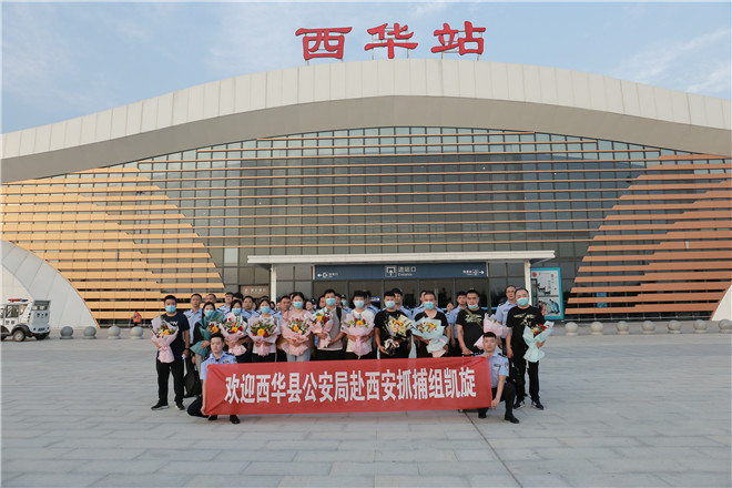 當(dāng)天,西華縣公安局在鄭阜高鐵西華站舉行歡迎儀式,迎接赴西安抓捕組凱旋歸來。特警在站臺上排列整齊、嚴(yán)陣以待,列車準(zhǔn)時(shí)??康秸?,7名犯罪嫌疑人隨即被押解下車,全副武裝的特警立即上前進(jìn)行押解交接,押往在高鐵出站口等候的裝甲車上。至此,歷經(jīng)三天三夜,一起電信網(wǎng)絡(luò)詐騙團(tuán)伙案成功告破。