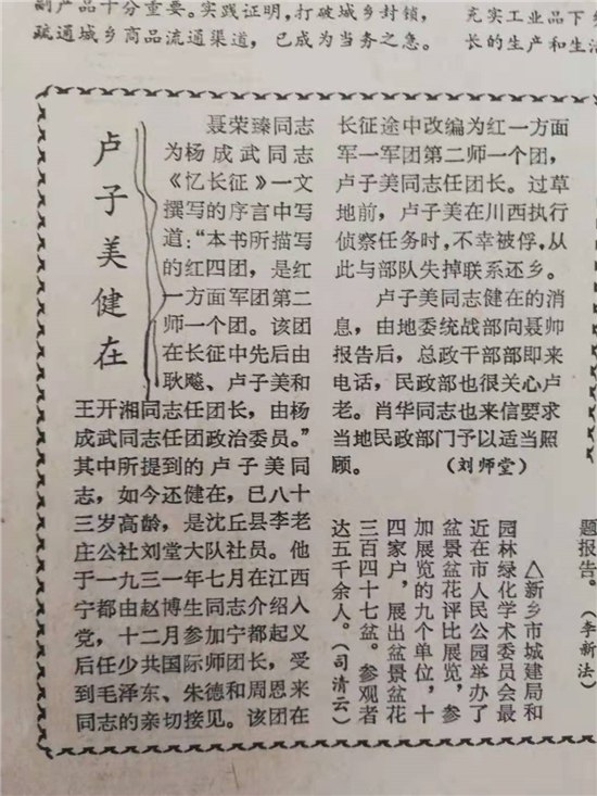 《河南日?qǐng)?bào)》刊發(fā)《盧子美健在》的消息