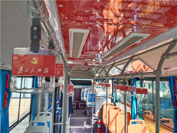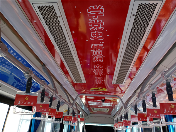 圖片說明:10月25日,記者在周口市公交總公司院內(nèi)看到,一輛車頭前印有“紅色主題班線”標(biāo)識的公交車格外引人注目,雖然該車的外形與其他車差別不大,可是車廂內(nèi)貼滿了紅色標(biāo)語口號,給人耳目一新的感覺。記者看到,車廂內(nèi)的扶手、座椅及車頂上都貼有“為人民服務(wù)”“學(xué)黨史、悟思想、辦實(shí)事、開新局”“革命小故事”等宣傳內(nèi)容。③2