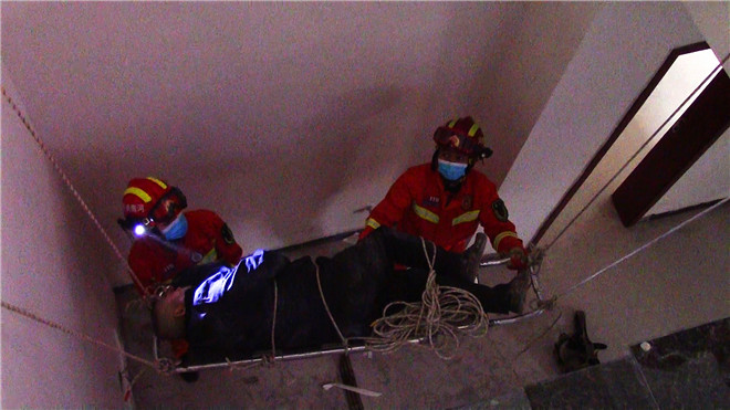 消防員到達(dá)現(xiàn)場(chǎng)后發(fā)現(xiàn),事發(fā)建筑內(nèi)設(shè)置有一個(gè)深約4米的地下室,一樓入戶門附近與地下室留有一個(gè)6平方米大小的空洞,老人不慎踩空墜入。老人受傷嚴(yán)重,無法翻身,不時(shí)傳來呻吟聲,現(xiàn)場(chǎng)情況十分緊急,救援刻不容緩。