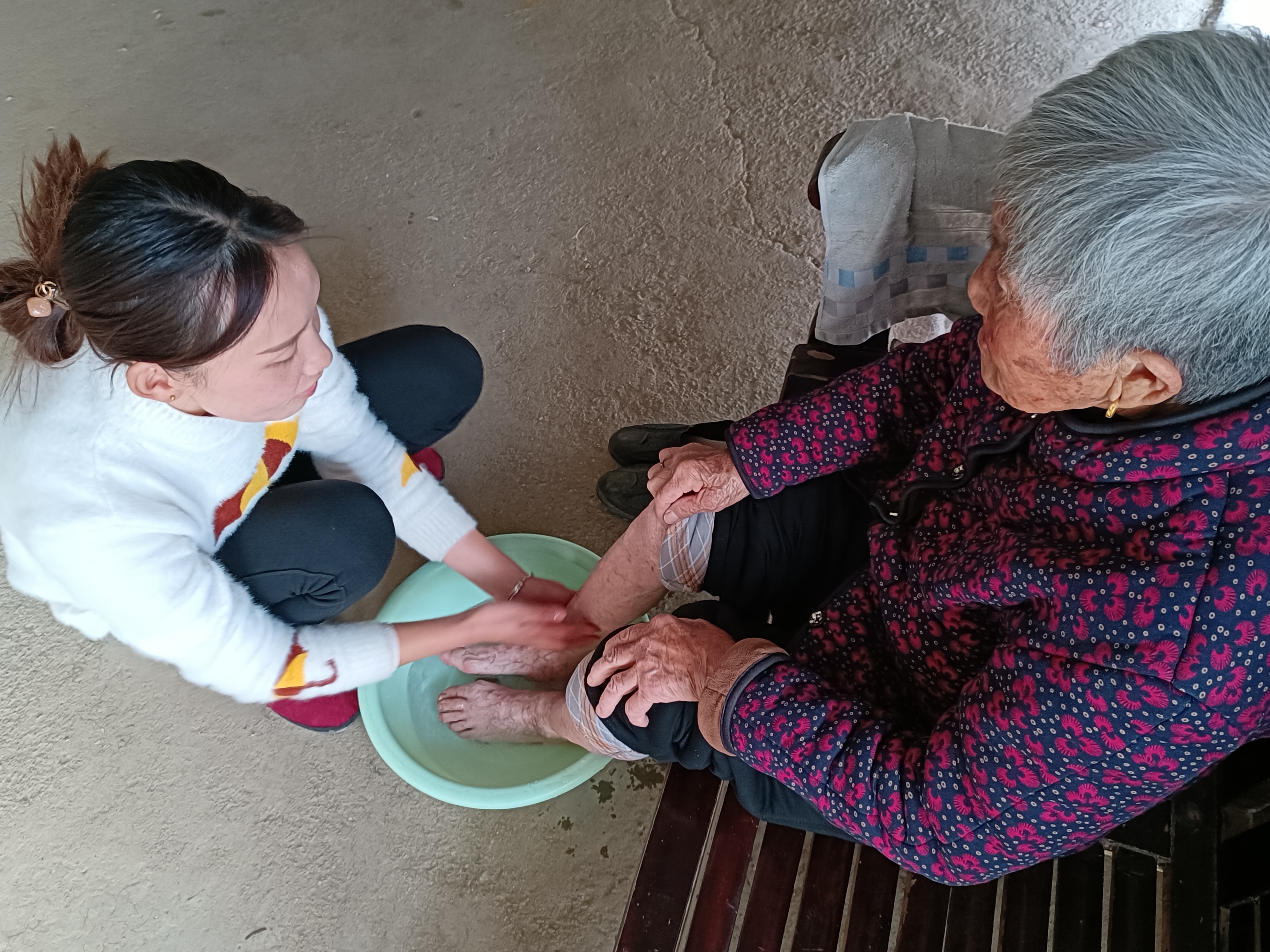 現(xiàn)年52歲的張書艷有三女一子,目前有兩個(gè)女兒已出嫁,小女兒郭錦大學(xué)畢業(yè)后在準(zhǔn)備招教考試,小兒子上小學(xué)六年級(jí)。言傳不如身教,在張書艷的帶動(dòng)下,孩子們對(duì)奶奶十分孝順,楊秀真逢人就夸:“俺孫女給我洗澡,俺孫子給我洗腳,他們整天讓我干干凈凈嘞!”