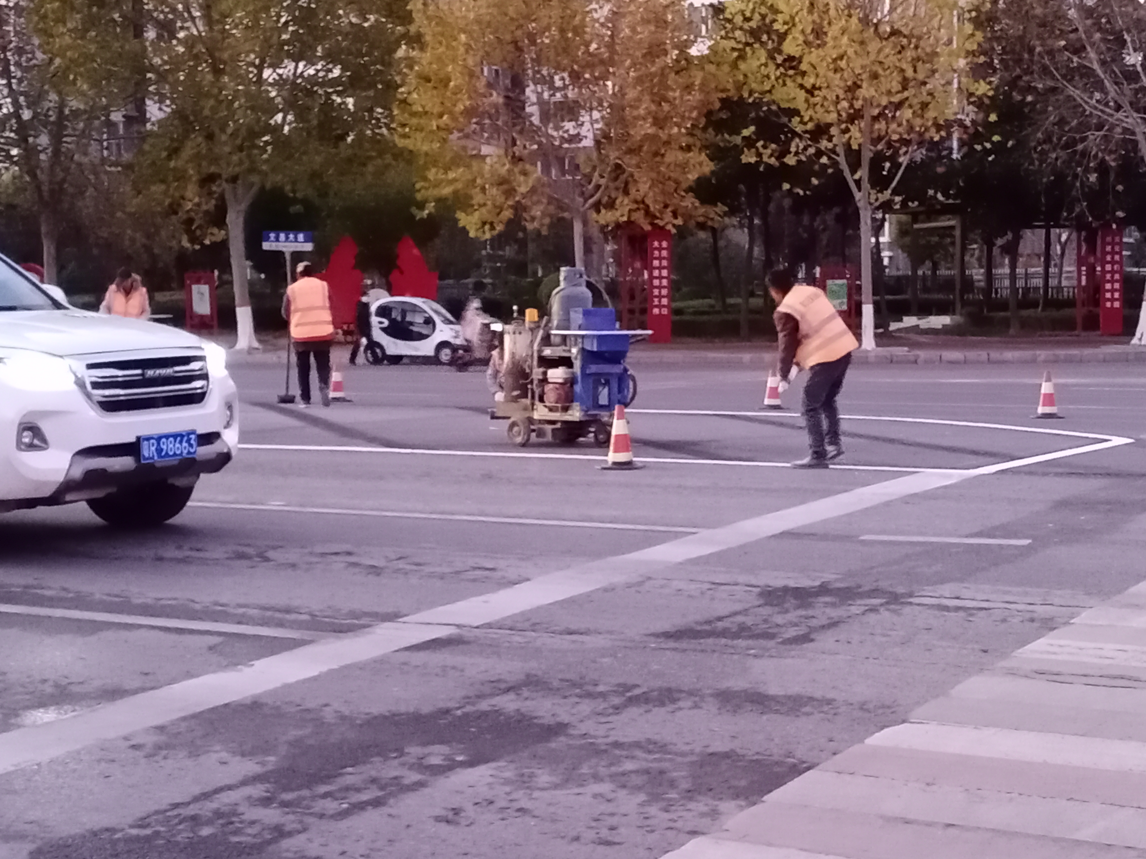11月9日17時許,記者在周口市中心城區(qū)文昌大道與中原路交叉口看到,施工人員正在對交叉路口上的交通標志線進行施劃,規(guī)范車輛和行人通行秩序,保證交通安全暢通有序,方便群眾出行。③3記者 張洪濤 攝