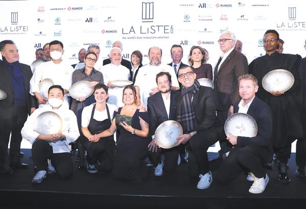 11月29日,在位于巴黎的法國(guó)外交部舉行的LA LISTE國(guó)際美食榜單揭曉活動(dòng)現(xiàn)場(chǎng),獲獎(jiǎng)廚師合影留念。