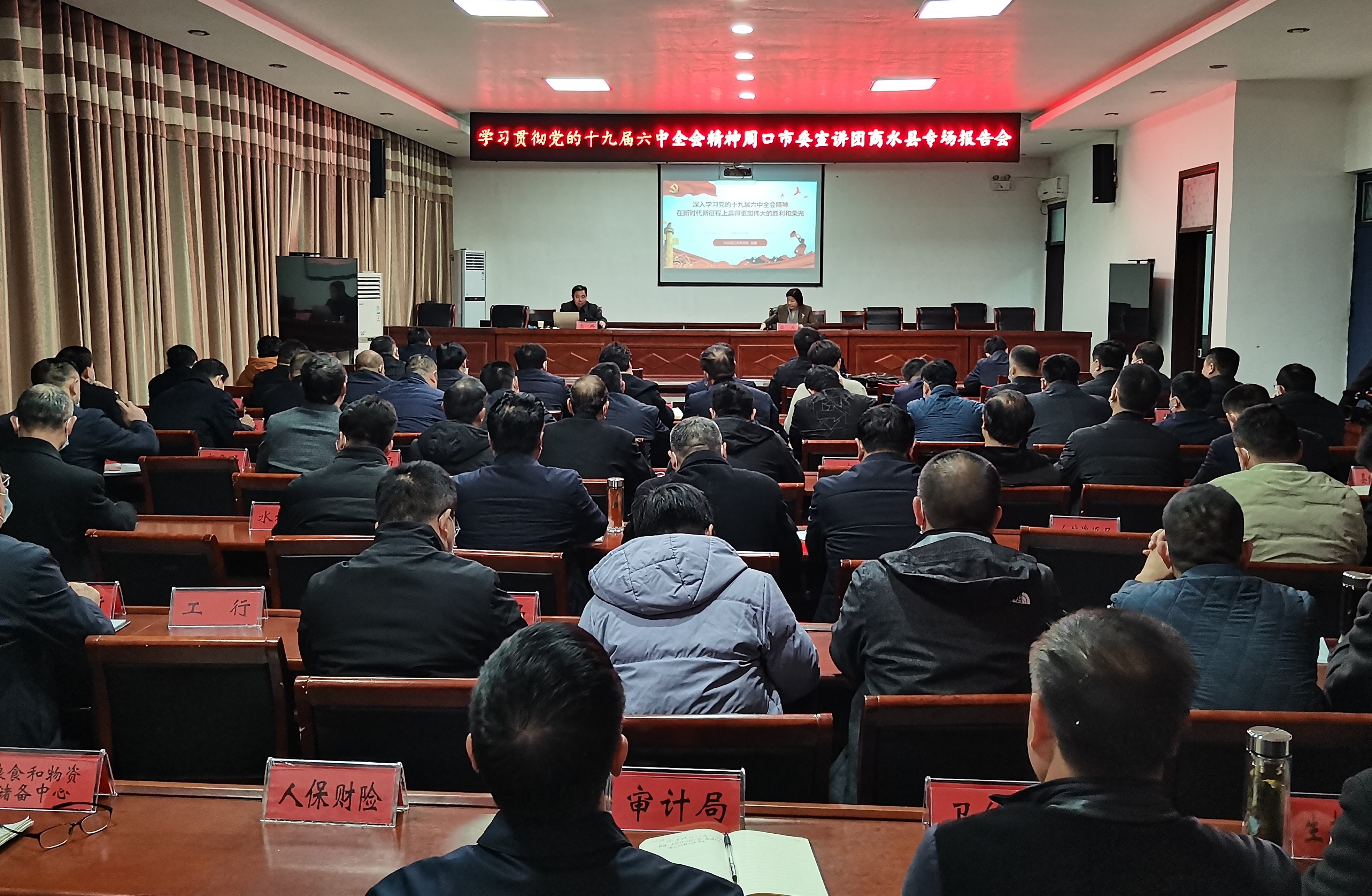 百年奮斗創(chuàng)輝煌,風(fēng)華正茂書(shū)華章。12月15日,學(xué)習(xí)貫徹黨的十九屆六中全會(huì)精神周口市委宣講團(tuán)商水縣專場(chǎng)報(bào)告會(huì)舉行,市委宣講團(tuán)成員高鵬作專題宣講報(bào)告,縣領(lǐng)導(dǎo)、鄉(xiāng)鎮(zhèn)辦事處和縣直單位主要負(fù)責(zé)人現(xiàn)場(chǎng)聆聽(tīng)。
