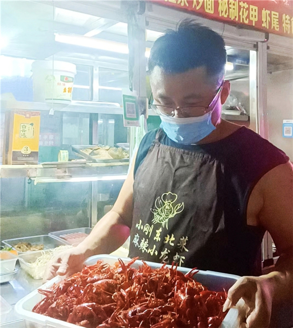 此時,在“東北小剛”麻辣小龍蝦夜攤前,已經(jīng)擺放好了幾張桌子,三五成群的客人相繼前來落座。客人點餐后,只見攤主“小剛”就站在操作臺前,手腳麻利地將提前準備好的小龍蝦等菜品一一裝盤,然后送到客人面前,忙得不可開交。