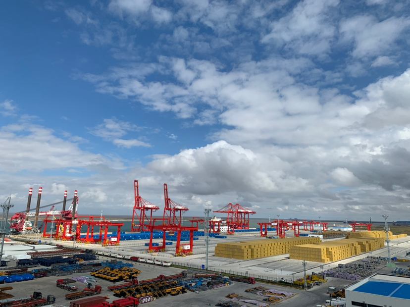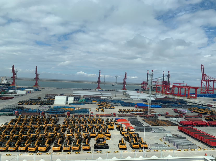 由于疫情防控的原因,記者沒能進(jìn)入港口核心區(qū),只能站在港口辦公大樓樓頂遠(yuǎn)眺港口。站在樓頂,港口景觀盡收眼底——挖掘機(jī)和風(fēng)機(jī)葉片被“碼”的整整齊齊,正待裝船出口;機(jī)器不停運(yùn)轉(zhuǎn),給??康拇谎b卸貨物;重型貨柜車進(jìn)出有序、川流不息。而令人驚奇的是,諾大的港口空無(wú)一人。