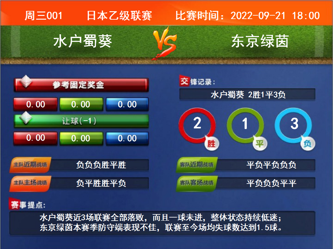 比賽時間:2022-09-21 18:00賽事提點:水戶蜀葵近3場聯(lián)賽全部落敗,而且一球未進,整體狀態(tài)持續(xù)低迷;東京綠茵本賽季防守端表現(xiàn)不佳,聯(lián)賽至今場均失球數(shù)達(dá)到1.5球。