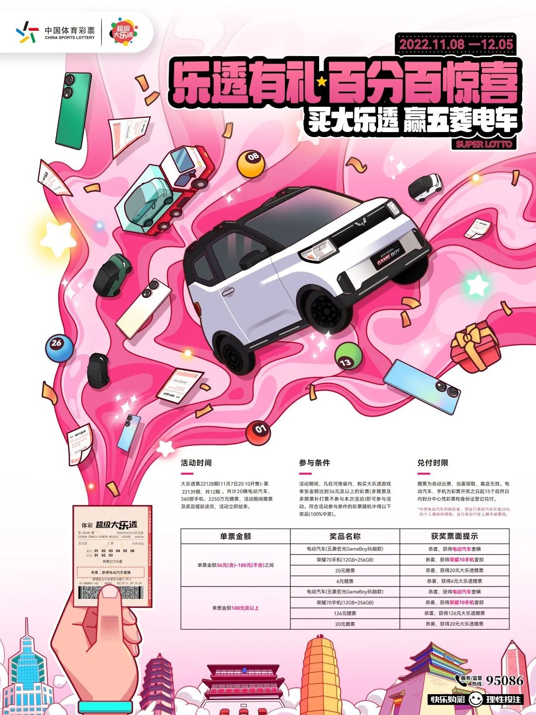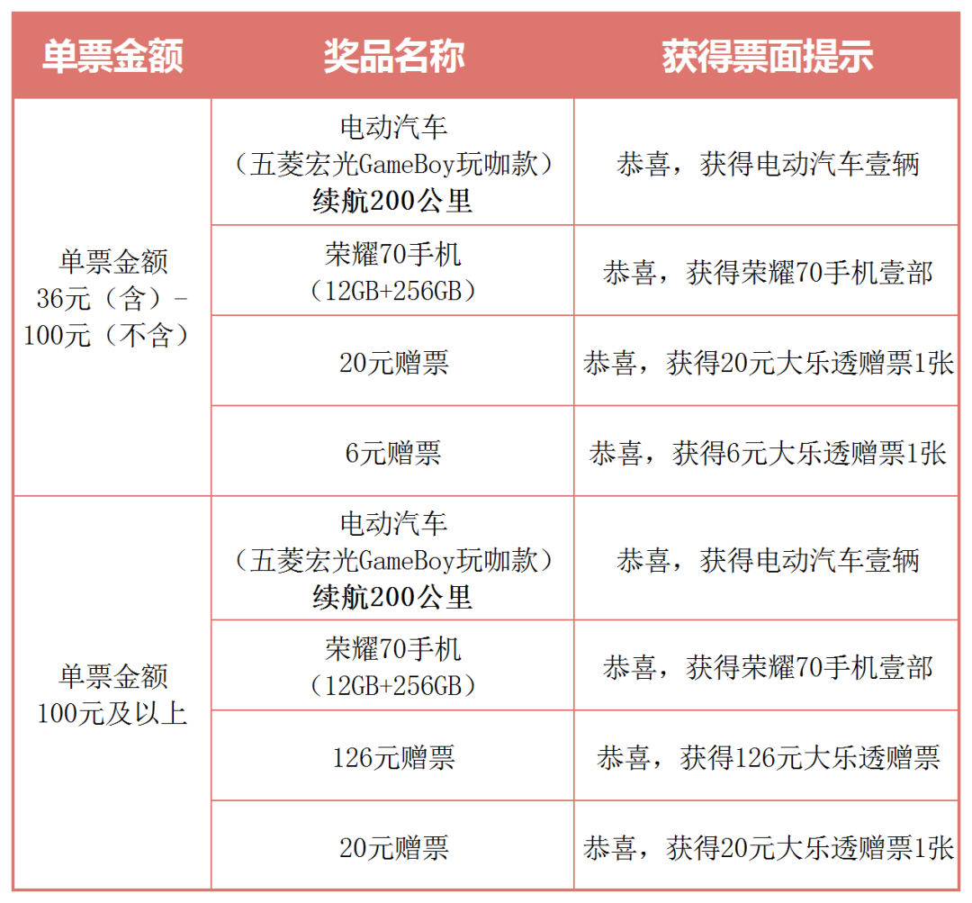 活動期間,凡在河南省內(nèi),購買大樂透游戲單張金額達到36元及以上的彩票(多期票及多期票補打票不參與本次活動,以下同)即可參與活動。有機會中得電動汽車、榮耀70手機、126元贈票、20元贈票、6元贈票等。