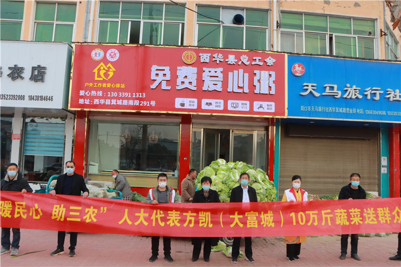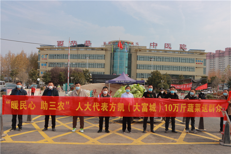 近日,方凱了解到西華縣黃橋鄉(xiāng)菜農(nóng)蔬菜滯銷的問題,便立即到現(xiàn)場察看,當(dāng)即決定幫助菜農(nóng)解決蔬菜滯銷難題,購買10萬斤蔬菜,并將這些蔬菜捐贈(zèng)給縣人民醫(yī)院、中醫(yī)院、敬老院等單位。
