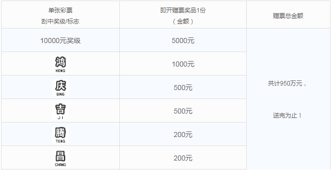 活動(dòng)期間,購(gòu)彩者在我省任一體彩銷售實(shí)體店購(gòu)買指定活動(dòng)票種,若單張彩票刮中符合獎(jiǎng)勵(lì)條件的獎(jiǎng)級(jí)或標(biāo)志,經(jīng)實(shí)體店終端兌獎(jiǎng)設(shè)備成功完成獎(jiǎng)金兌付(如中獎(jiǎng))及促銷兌獎(jiǎng)掃描后,即可獲得即開票贈(zèng)票獎(jiǎng)品一份??傤~有限,送完為止,詳見下表: