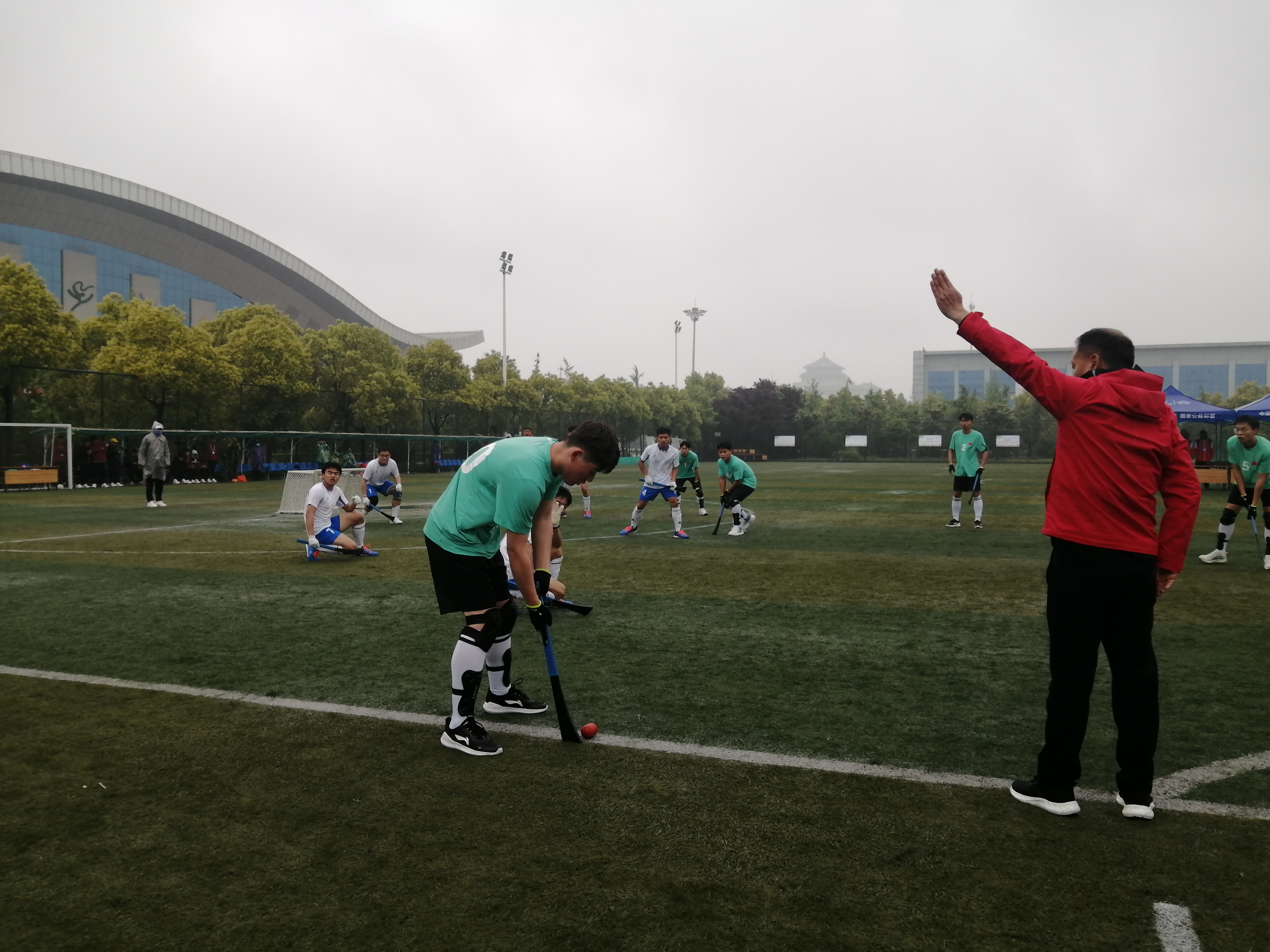 上午8時(shí)30分,淅瀝瀝小雨和大幅降溫讓大家感到非常不適,周口和鄭州兩支代表隊(duì)的10名運(yùn)動員卻精神抖擻齊聚賽場。隨著一聲哨響比賽開始,兩隊(duì)球員揮動擊球板擊打木球,一場激烈比賽便開始了。